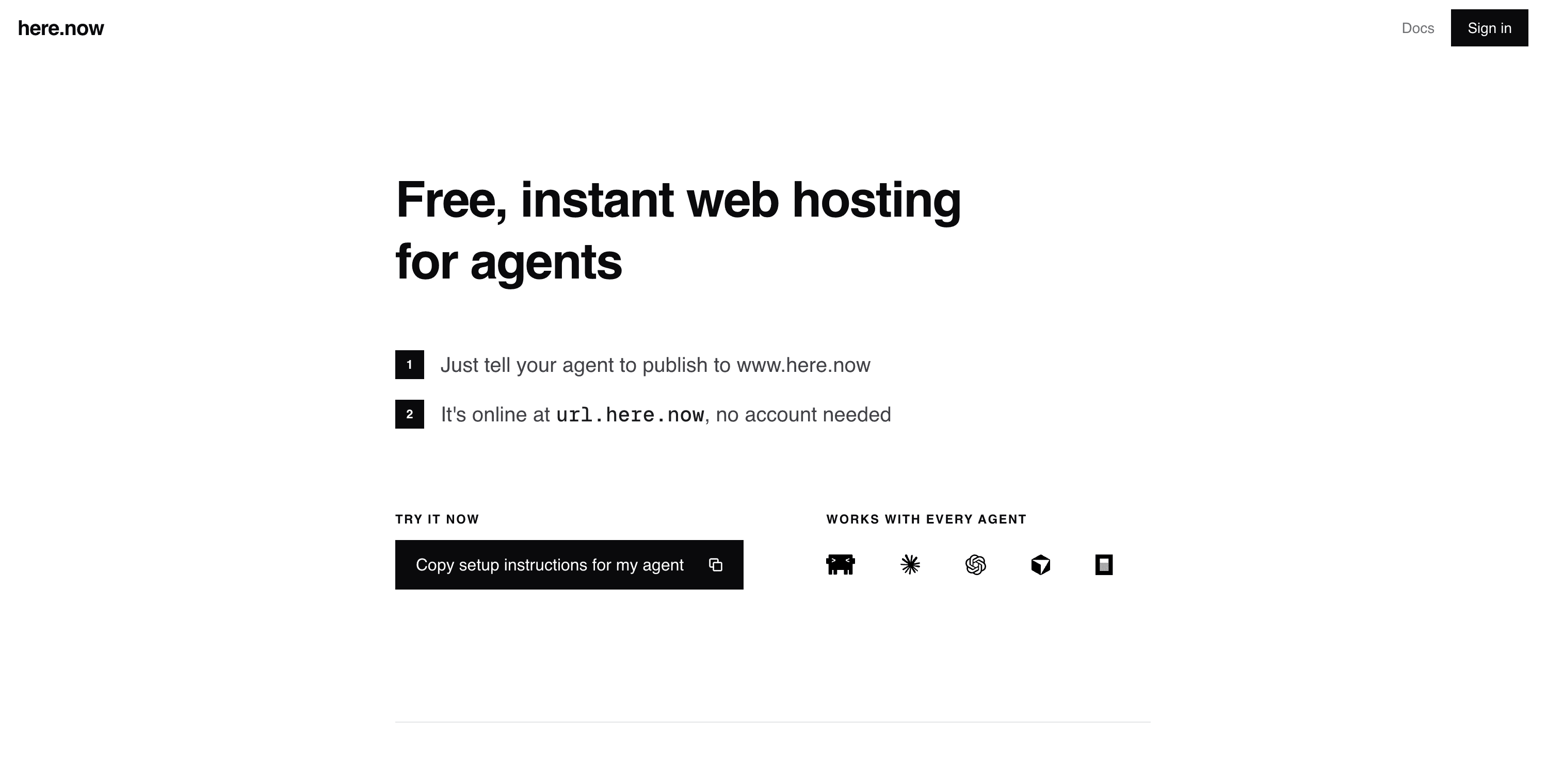 Go to here.now, grab the setup instructions, and paste them into your agent. If you want your sites to stay up permanently, create an account — also free. The whole thing takes less than two minutes.